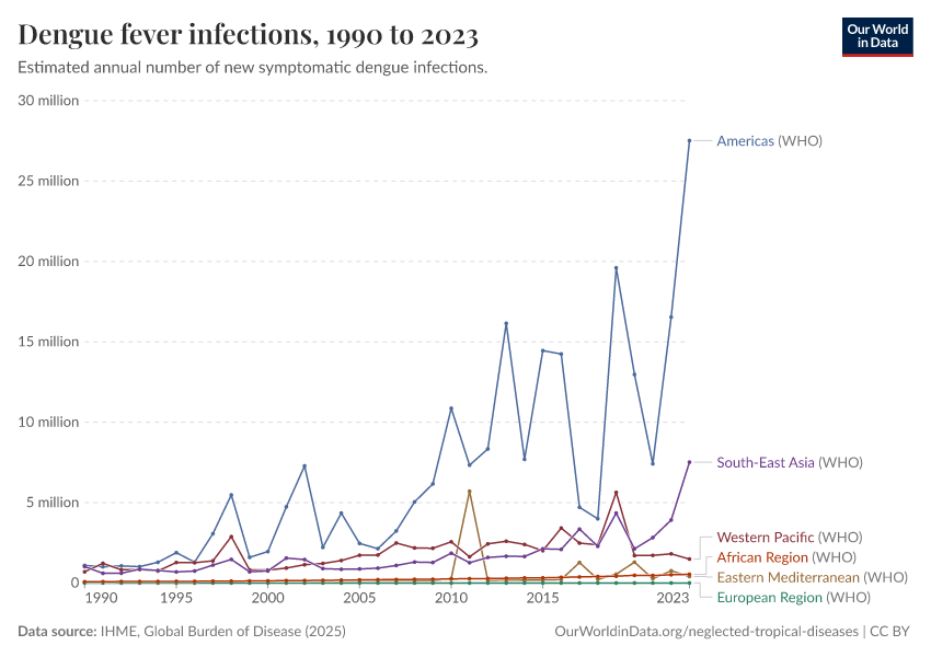 “Data Page: Dengue fever infections”, part of the following publication: Esteban Ortiz-Ospina and Max Roser (2016) - “Global Health”. Data adapted from IHME, Global Burden of Disease. Retrieved from https://tag-updates.owid.pages.dev:8789/20260212-172859/grapher/dengue-incidence.html [online resource] (archived on February 12, 2026).