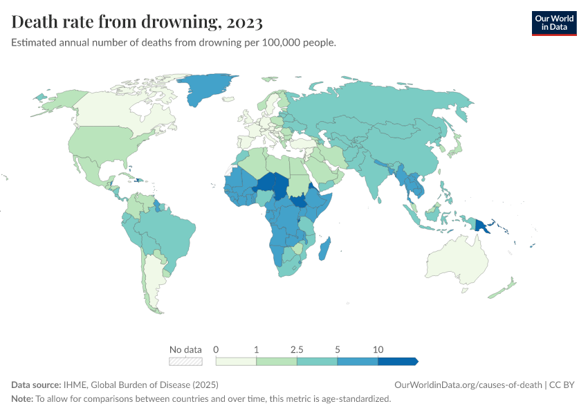IHME, Global Burden of Disease (2025) – with major processing by Our World in Data. “Death rate from drowning” [dataset]. IHME, Global Burden of Disease, “Global Burden of Disease - Deaths” [original data]. Retrieved February 27, 2026 from https://tag-updates.owid.pages.dev:8789/20260211-173942/grapher/drowning-death-rates.html (archived on February 11, 2026).