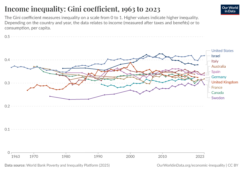 World Bank Poverty and Inequality Platform (2025) – with major processing by Our World in Data. “Income inequality: Gini coefficient – World Bank” [dataset]. World Bank Poverty and Inequality Platform, “World Bank Poverty and Inequality Platform (PIP) 20250930_2021, 20250930_2017” [original data]. Retrieved February 27, 2026 from https://tag-updates.owid.pages.dev:8789/20260127-114142/grapher/economic-inequality-gini-index.html (archived on January 27, 2026).