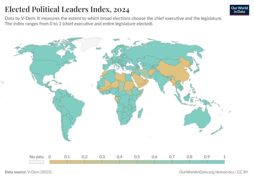 “Data Page: Elected officials index”, part of the following publication: Bastian Herre, Lucas Rodés-Guirao, and Esteban Ortiz-Ospina (2013) - “Democracy”. Data adapted from V-Dem. Retrieved from https://tag-updates.owid.pages.dev:8789/20260119-070102/grapher/elected-political-leaders-index.html [online resource] (archived on January 19, 2026).How to cite this data