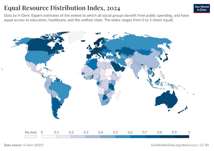 “Data Page: Equal resource distribution index”, part of the following publication: Bastian Herre, Lucas Rodés-Guirao, and Esteban Ortiz-Ospina (2013) - “Democracy”. Data adapted from V-Dem. Retrieved from https://tag-updates.owid.pages.dev:8789/20260119-070102/grapher/equal-resource-distribution-index.html [online resource] (archived on January 19, 2026).How to cite this data