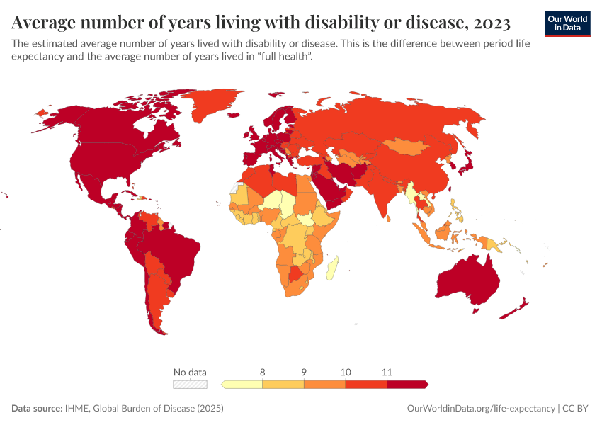 “Data Page: Average number of years living with disability or disease”, part of the following publication: Saloni Dattani, Lucas Rodés-Guirao, Hannah Ritchie, Esteban Ortiz-Ospina, and Max Roser (2023) - “Life Expectancy”. Data adapted from IHME, Global Burden of Disease. Retrieved from https://tag-updates.owid.pages.dev:8789/20260213-171235/grapher/expected-years-of-living-with-disability-or-disease-burden.html [online resource] (archived on February 13, 2026).How to cite this data