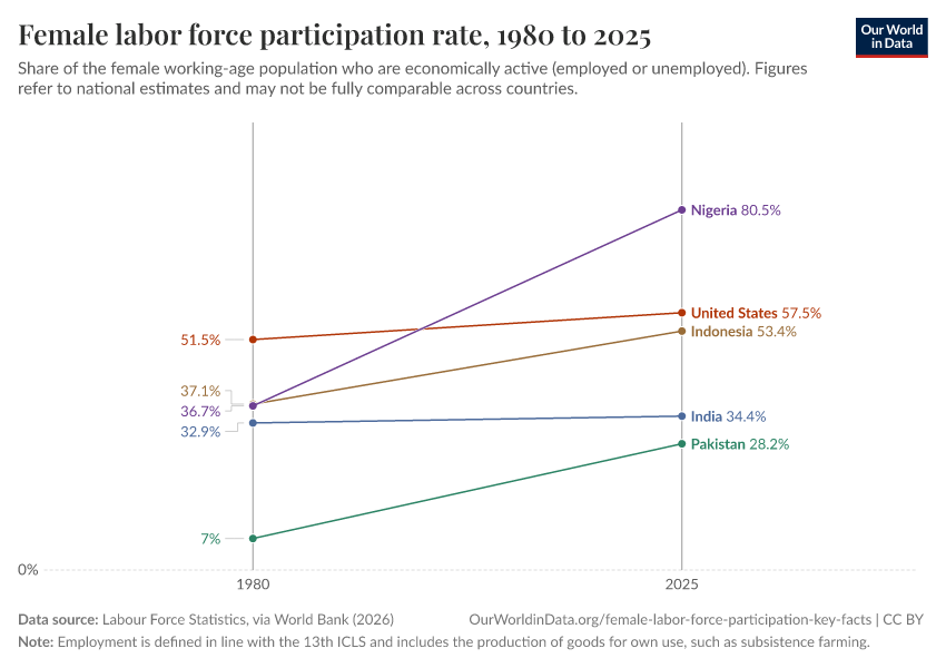 “Data Page: Female labor force participation rate”. Our World in Data (2026). Data adapted from Labour Force Statistics, via World Bank. Retrieved from https://tag-updates.owid.pages.dev:8789/20260218-113149/grapher/female-labor-force-participation-rates-slopes.html [online resource] (archived on February 18, 2026).