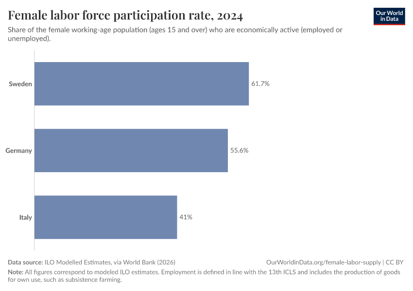 “Data Page: Female labor force participation rate”. Our World in Data (2026). Data adapted from ILO Modelled Estimates, via World Bank. Retrieved from https://tag-updates.owid.pages.dev:8789/20260223-234835/grapher/female-labor-force-participation-rates.html [online resource] (archived on February 23, 2026).How to cite this data