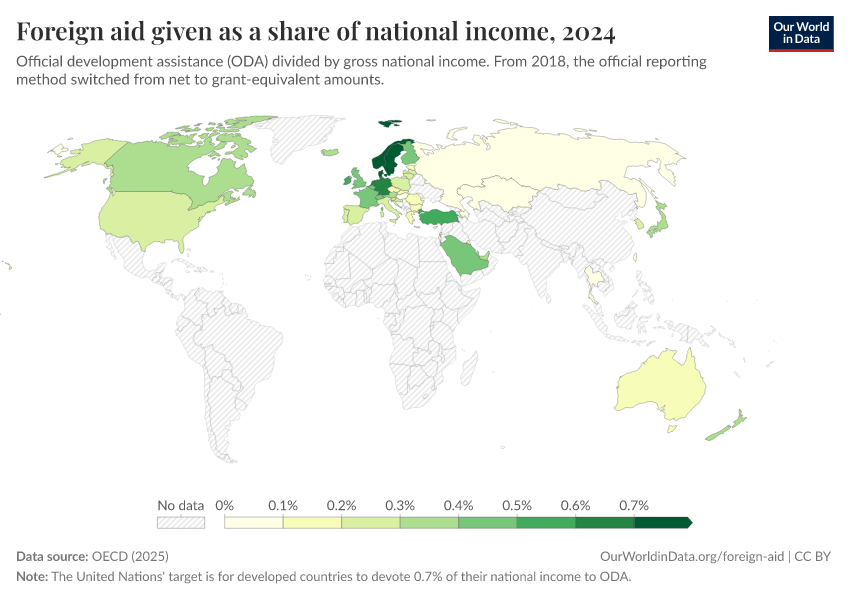 “Data Page: Foreign aid given as a share of national income”, part of the following publication: Bastian Herre, Pablo Arriagada, Simon van Teutem, and Hannah Ritchie (2024) - “Foreign Aid”. Data adapted from OECD. Retrieved from https://tag-updates.owid.pages.dev:8789/20251230-141326/grapher/foreign-aid-given-as-a-share-of-national-income.html [online resource] (archived on December 30, 2025).How to cite this data