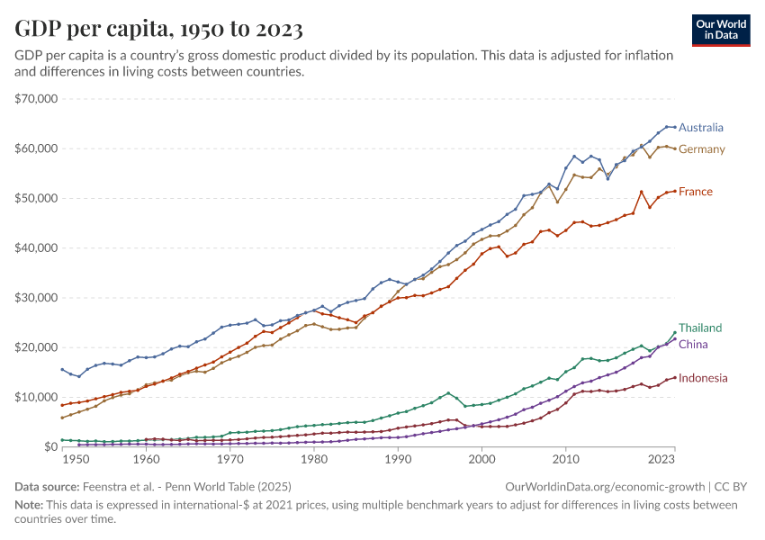 “Data Page: GDP per capita”, part of the following publication: Max Roser, Bertha Rohenkohl, Pablo Arriagada, Joe Hasell, Hannah Ritchie, and Esteban Ortiz-Ospina (2023) - “Economic Growth”. Data adapted from Feenstra et al.. Retrieved from https://tag-updates.owid.pages.dev:8789/20251013-111729/grapher/gdp-per-capita-penn-world-table.html [online resource] (archived on October 13, 2025).How to cite this data