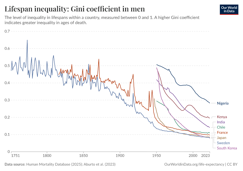 “Data Page: Lifespan inequality: Gini coefficient in men”, part of the following publication: Saloni Dattani, Lucas Rodés-Guirao, Hannah Ritchie, Esteban Ortiz-Ospina, and Max Roser (2023) - “Life Expectancy”. Data adapted from Human Mortality Database, United Nations. Retrieved from https://tag-updates.owid.pages.dev:8789/20251022-222946/grapher/gini-coefficient-of-lifespan-inequality-in-males.html [online resource] (archived on October 22, 2025).How to cite this data