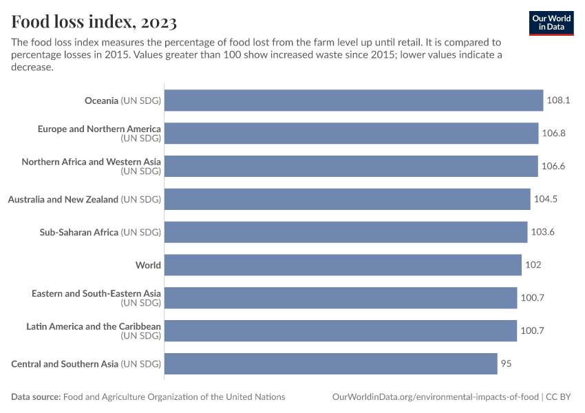 Food and Agriculture Organization of the United Nations – with minor processing by Our World in Data. “Food loss index” [dataset]. Food and Agriculture Organization of the United Nations, “FAO” [original data]. Retrieved February 27, 2026 from https://tag-updates.owid.pages.dev:8789/20260130-180113/grapher/global-food-loss-index.html (archived on January 30, 2026).