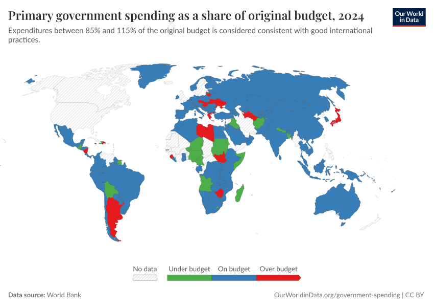 “Data Page: Primary government spending as a share of original budget”, part of the following publication: Esteban Ortiz-Ospina, Bertha Rohenkohl, Pablo Arriagada, and Max Roser (2016) - “Government Spending”. Data adapted from World Bank. Retrieved from https://tag-updates.owid.pages.dev:8789/20251120-211749/grapher/govt-expenditure-share-budget.html [online resource] (archived on November 20, 2025).How to cite this data