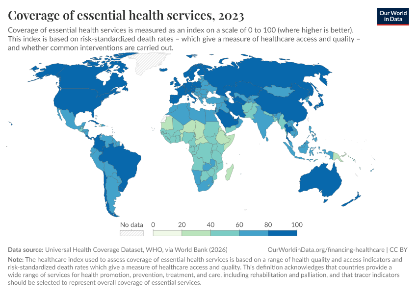 “Data Page: Coverage of essential health services”. Our World in Data (2026). Data adapted from Universal Health Coverage Dataset, WHO, via World Bank. Retrieved from https://tag-updates.owid.pages.dev:8789/20260202-181317/grapher/healthcare-access-quality-un.html [online resource] (archived on February 2, 2026).How to cite this data