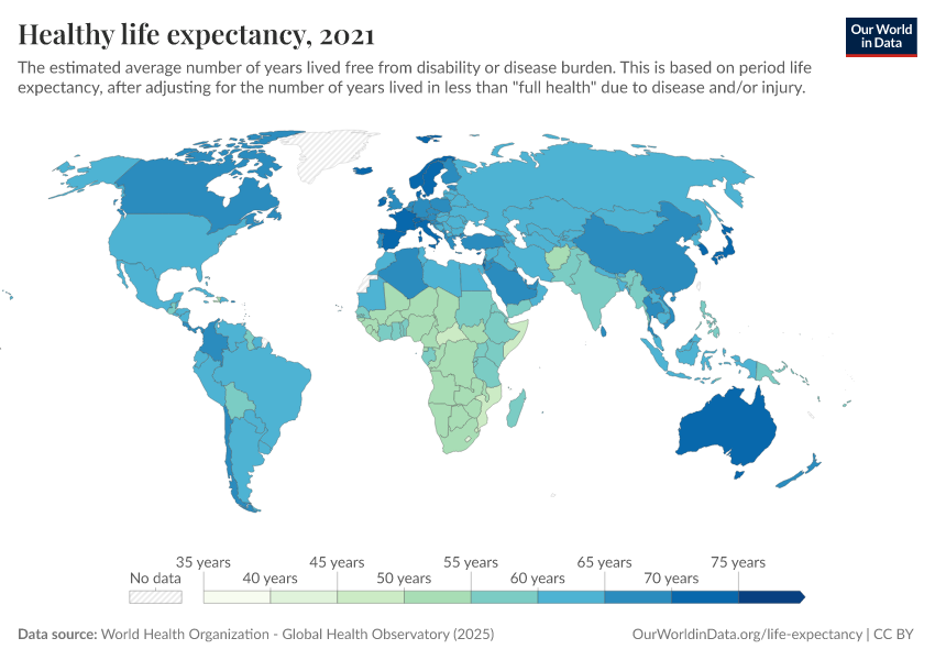 “Data Page: Healthy life expectancy”. Our World in Data (2026). Data adapted from World Health Organization. Retrieved from https://tag-updates.owid.pages.dev:8789/20260119-070102/grapher/healthy-life-expectancy-at-birth.html [online resource] (archived on January 19, 2026).How to cite this data