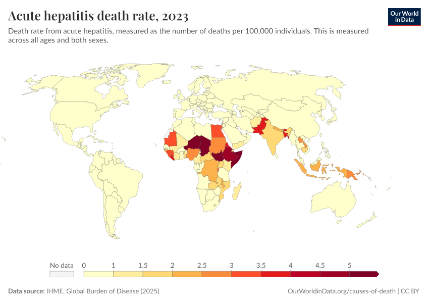 “Data Page: Acute hepatitis death rate”, part of the following publication: Esteban Ortiz-Ospina and Max Roser (2016) - “Global Health”. Data adapted from IHME, Global Burden of Disease. Retrieved from https://tag-updates.owid.pages.dev:8789/20260211-174736/grapher/hepatitis-death-rate.html [online resource] (archived on February 11, 2026).How to cite this data