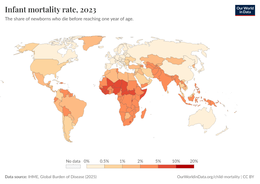 IHME, Global Burden of Disease (2025) – with minor processing by Our World in Data. “Infant mortality rate” [dataset]. IHME, Global Burden of Disease, “Global Burden of Disease - Child Mortality” [original data]. Retrieved February 27, 2026 from https://tag-updates.owid.pages.dev:8789/20260213-140117/grapher/infant-mortality-rate.html (archived on February 13, 2026).