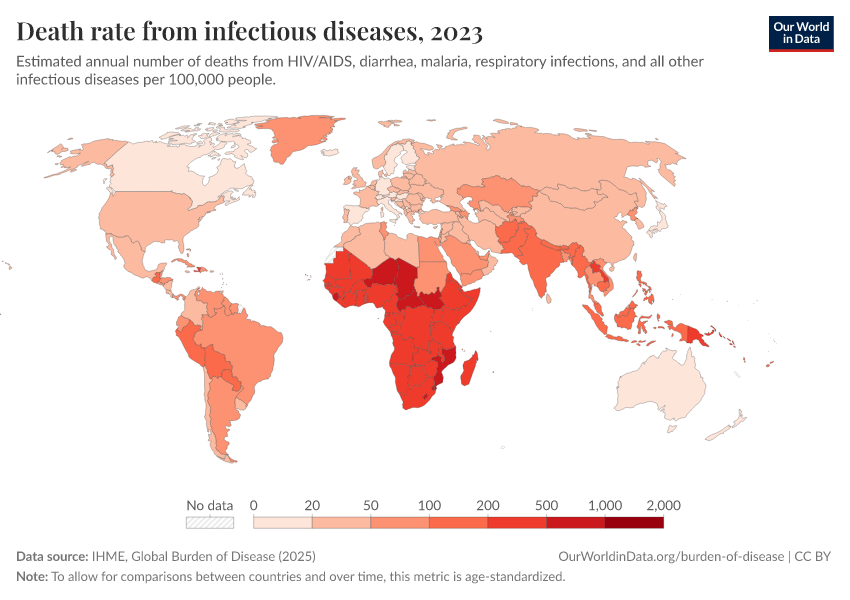 “Data Page: Death rate from infectious diseases”, part of the following publication: Esteban Ortiz-Ospina and Max Roser (2016) - “Global Health”. Data adapted from IHME, Global Burden of Disease. Retrieved from https://tag-updates.owid.pages.dev:8789/20260211-174736/grapher/infectious-disease-death-rates.html [online resource] (archived on February 11, 2026).
