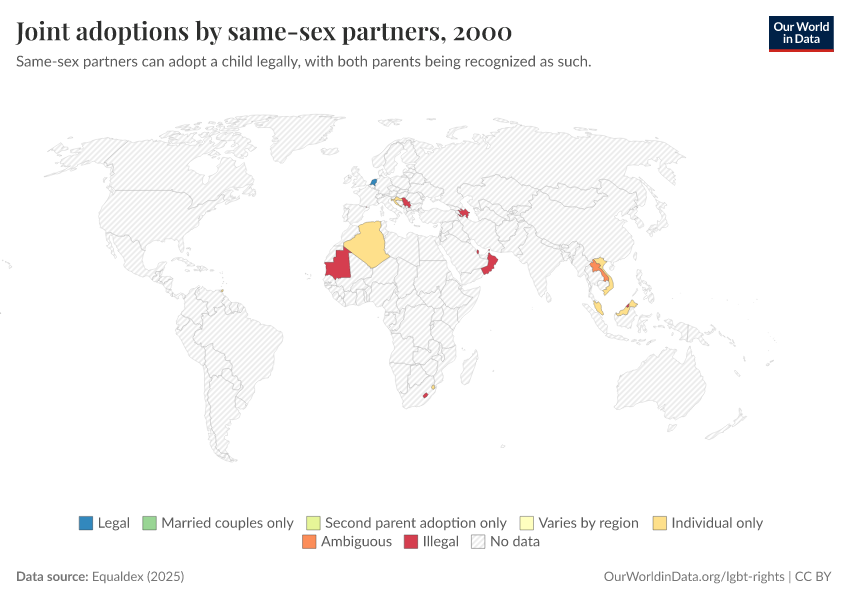 “Data Page: Joint adoptions by same-sex partners”, part of the following publication: Bastian Herre and Pablo Arriagada (2023) - “LGBT+ Rights”. Data adapted from Equaldex. Retrieved from https://tag-updates.owid.pages.dev:8789/20250909-093708/grapher/joint-adoptions-same-sex-partners-equaldex.html [online resource] (archived on September 9, 2025).How to cite this data