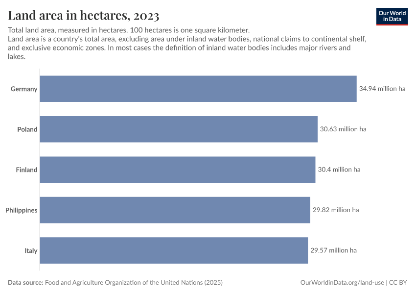 “Data Page: Land area in hectares”, part of the following publication: Hannah Ritchie, Pablo Rosado, and Max Roser (2023) - “Agricultural Production”. Data adapted from Food and Agriculture Organization of the United Nations. Retrieved from https://tag-updates.owid.pages.dev:8789/20260226-122020/grapher/land-area-hectares.html [online resource] (archived on February 26, 2026).How to cite this data