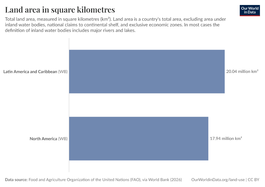 Food and Agriculture Organization of the United Nations (FAO), via World Bank (2026) – processed by Our World in Data. “Land area in square kilometres” [dataset]. Food and Agriculture Organization of the United Nations (FAO), via World Bank, “World Development Indicators 125” [original data]. Retrieved February 27, 2026 from https://tag-updates.owid.pages.dev:8789/20260202-181317/grapher/land-area-km.html (archived on February 2, 2026).