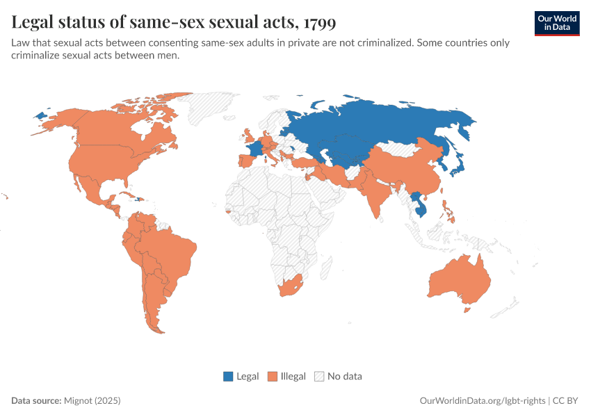 “Data Page: Legal status of same-sex sexual acts”, part of the following publication: Bastian Herre and Pablo Arriagada (2023) - “LGBT+ Rights”. Data adapted from Mignot. Retrieved from https://tag-updates.owid.pages.dev:8789/20250909-093708/grapher/legal-status-of-same-sex-sexual-acts.html [online resource] (archived on September 9, 2025).How to cite this data