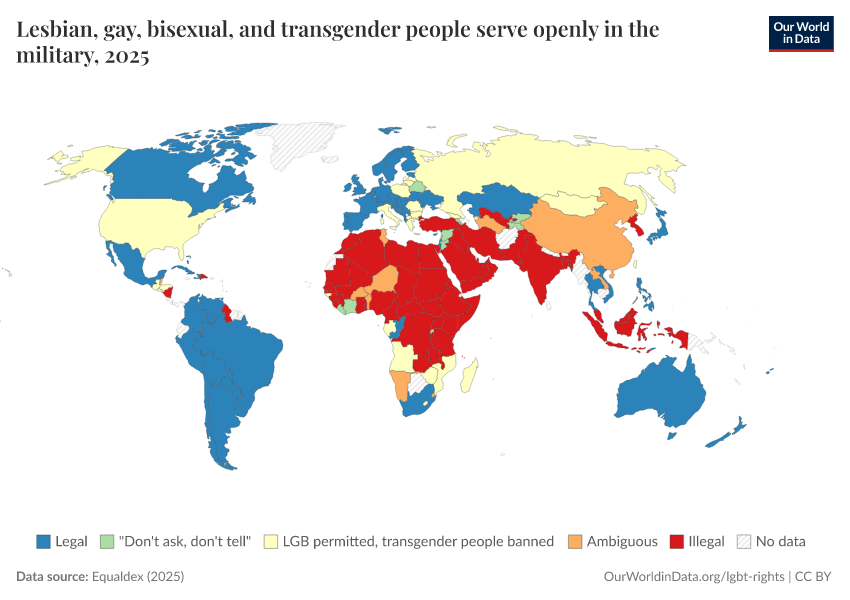 “Data Page: Lesbian, gay, bisexual, and transgender people serve openly in the military”, part of the following publication: Bastian Herre and Pablo Arriagada (2023) - “LGBT+ Rights”. Data adapted from Equaldex. Retrieved from https://tag-updates.owid.pages.dev:8789/20250909-093708/grapher/lgbt-military-equaldex.html [online resource] (archived on September 9, 2025).How to cite this data