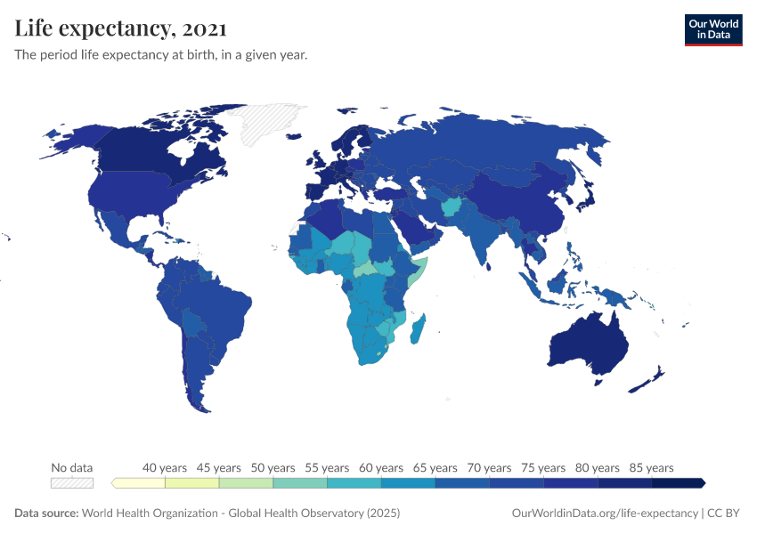 “Data Page: Life expectancy”. Our World in Data (2026). Data adapted from World Health Organization. Retrieved from https://tag-updates.owid.pages.dev:8789/20260119-070102/grapher/life-expectancy-at-birth-who-gho.html [online resource] (archived on January 19, 2026).How to cite this data