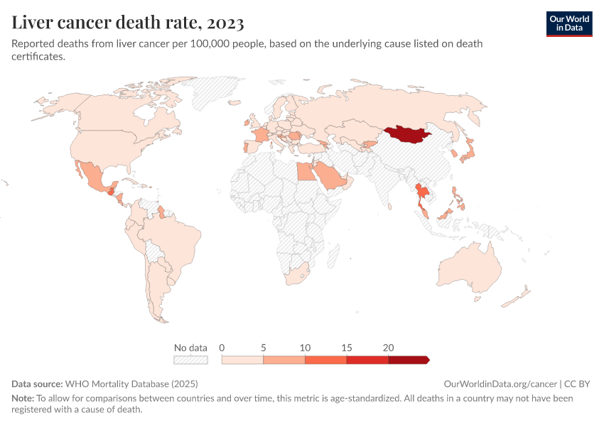 WHO Mortality Database (2025) – with minor processing by Our World in Data. “Liver cancer death rate” [dataset]. WHO Mortality Database, “WHO Mortality Database” [original data]. Retrieved February 27, 2026 from https://tag-updates.owid.pages.dev:8789/20250909-093708/grapher/liver-cancer-death-rate.html (archived on September 9, 2025).