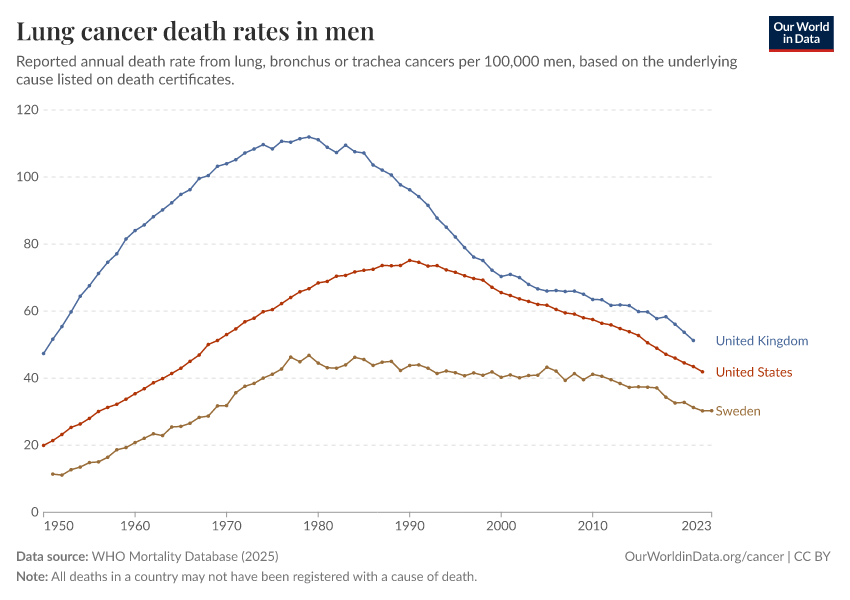 “Data Page: Lung cancer death rates in men”, part of the following publication: Saloni Dattani, Fiona Spooner, Hannah Ritchie, and Max Roser (2023) - “Causes of Death”. Data adapted from WHO Mortality Database. Retrieved from https://tag-updates.owid.pages.dev:8789/20250909-093708/grapher/lung-cancer-death-rates-males.html [online resource] (archived on September 9, 2025).How to cite this data