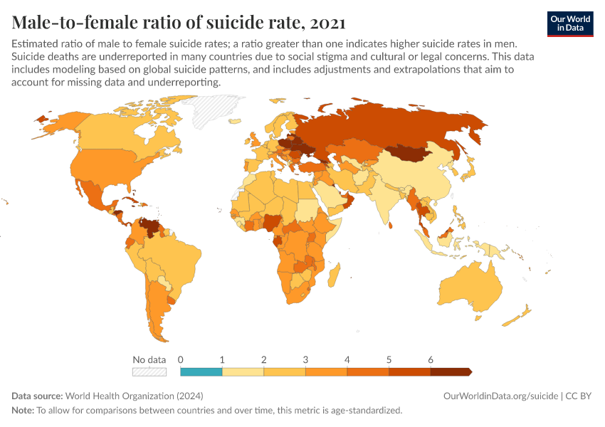 World Health Organization (2024) – with major processing by Our World in Data. “Male-to-female ratio of suicide rate” [dataset]. World Health Organization, “Global Health Estimates” [original data]. Retrieved February 27, 2026 from https://tag-updates.owid.pages.dev:8789/20250909-093708/grapher/male-female-ratio-suicides-rates.html (archived on September 9, 2025).