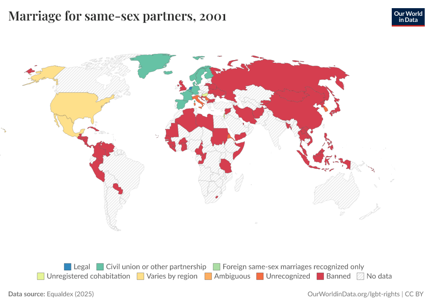 “Data Page: Marriage for same-sex partners”, part of the following publication: Bastian Herre and Pablo Arriagada (2023) - “LGBT+ Rights”. Data adapted from Equaldex. Retrieved from https://tag-updates.owid.pages.dev:8789/20250909-093708/grapher/marriage-same-sex-partners-equaldex.html [online resource] (archived on September 9, 2025).