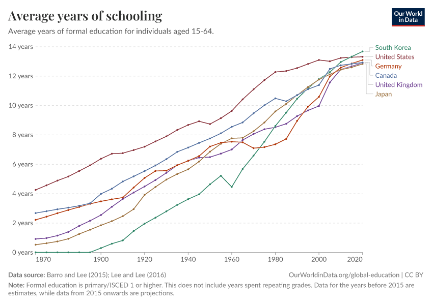 Barro and Lee (2015); Lee and Lee (2016) – with major processing by Our World in Data. “Average years of schooling” [dataset]. Barro and Lee, “Projections of Educational Attainment”; Lee and Lee, “Human Capital in the Long Run” [original data]. Retrieved February 27, 2026 from https://tag-updates.owid.pages.dev:8789/20260119-070102/grapher/mean-years-of-schooling-long-run.html (archived on January 19, 2026).