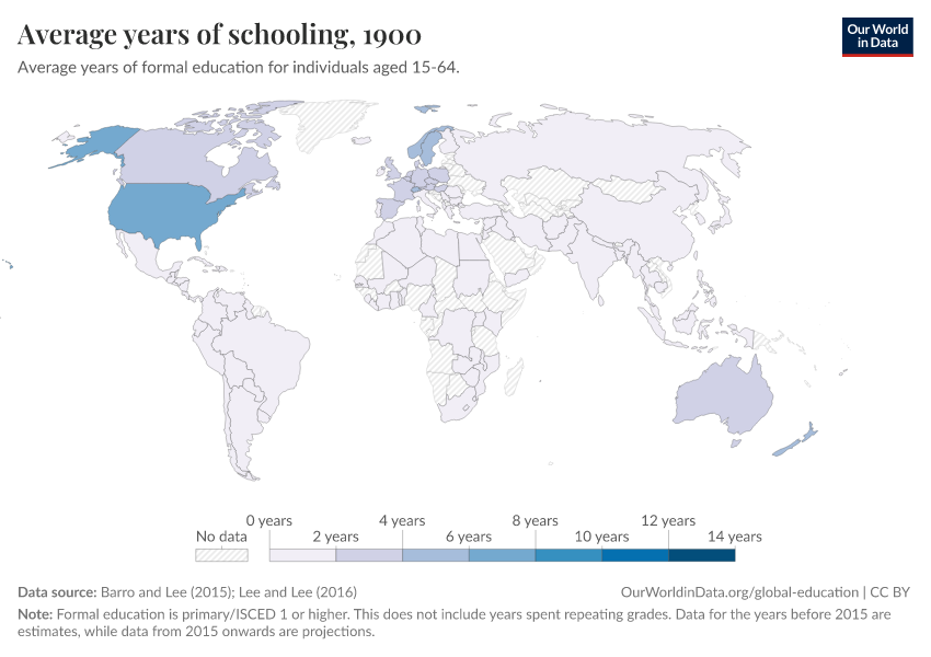 Barro and Lee (2015); Lee and Lee (2016) – with major processing by Our World in Data. “Average years of schooling” [dataset]. Barro and Lee, “Projections of Educational Attainment”; Lee and Lee, “Human Capital in the Long Run” [original data]. Retrieved February 27, 2026 from https://tag-updates.owid.pages.dev:8789/20260119-070102/grapher/mean-years-of-schooling-long-run.html (archived on January 19, 2026).