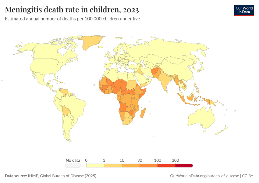 “Data Page: Meningitis death rate in children”, part of the following publication: Esteban Ortiz-Ospina and Max Roser (2016) - “Global Health”. Data adapted from IHME, Global Burden of Disease. Retrieved from https://tag-updates.owid.pages.dev:8789/20260211-174736/grapher/meningitis-death-rates-children-under-5.html [online resource] (archived on February 11, 2026).How to cite this data