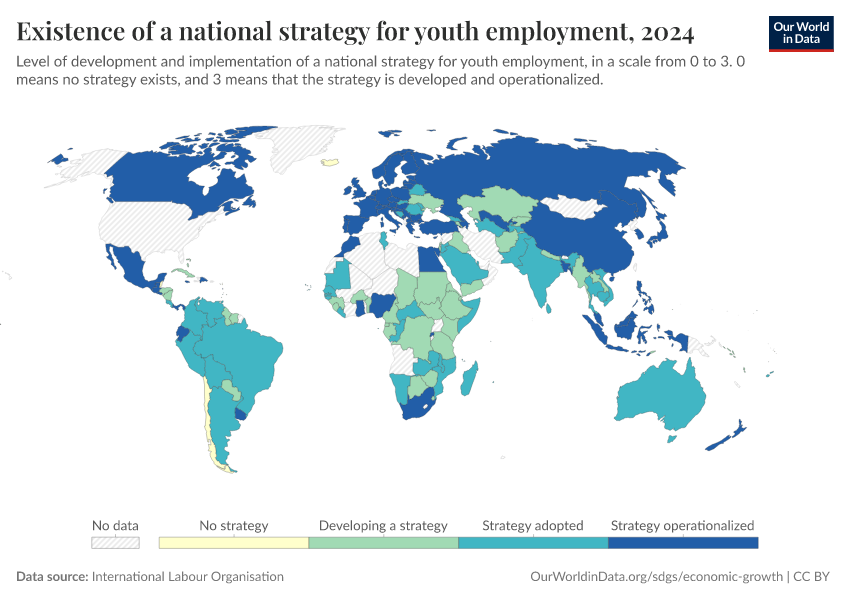 “Data Page: Existence of a national strategy for youth employment”, part of the following publication: Max Roser, Bertha Rohenkohl, Pablo Arriagada, Joe Hasell, Hannah Ritchie, and Esteban Ortiz-Ospina (2023) - “Economic Growth”. Data adapted from International Labour Organisation. Retrieved from https://tag-updates.owid.pages.dev:8789/20251120-211749/grapher/national-strategy-for-youth-employment.html [online resource] (archived on November 20, 2025).How to cite this data