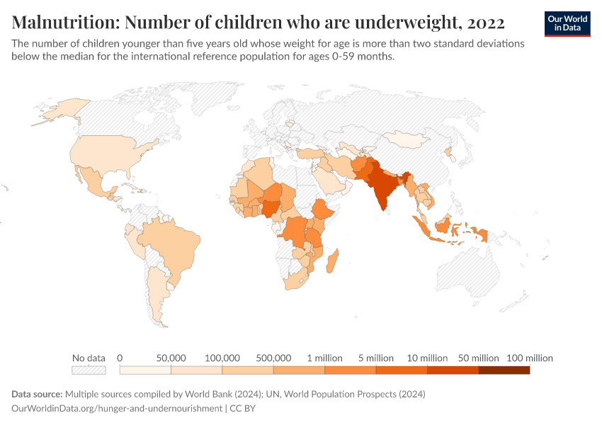 “Data Page: Number of underweight children”. Our World in Data (2026). Data adapted from UNICEF, WHO, World Bank, United Nations. Retrieved from https://tag-updates.owid.pages.dev:8789/20260119-070102/grapher/number-of-children-who-are-underweight.html [online resource] (archived on January 19, 2026).How to cite this data