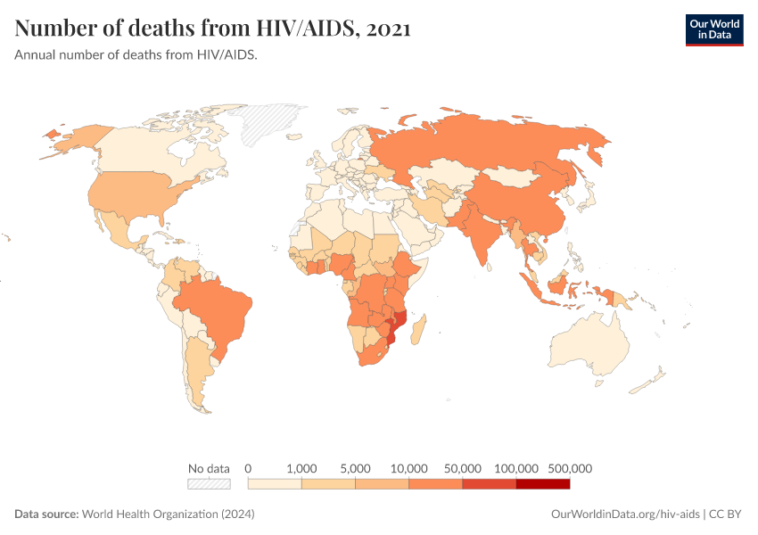 “Data Page: Number of deaths from HIV/AIDS”, part of the following publication: Esteban Ortiz-Ospina and Max Roser (2016) - “Global Health”. Data adapted from World Health Organization. Retrieved from https://tag-updates.owid.pages.dev:8789/20250909-093708/grapher/number-of-deaths-from-hivaids-who.html [online resource] (archived on September 9, 2025).How to cite this data