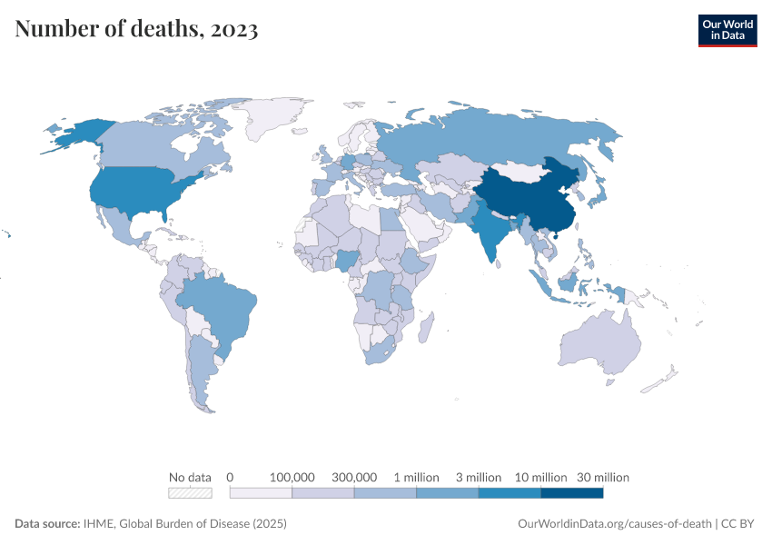 “Data Page: Number of deaths”, part of the following publication: Esteban Ortiz-Ospina and Max Roser (2016) - “Global Health”. Data adapted from IHME, Global Burden of Disease. Retrieved from https://tag-updates.owid.pages.dev:8789/20260211-174736/grapher/number-of-deaths-gbd.html [online resource] (archived on February 11, 2026).How to cite this data