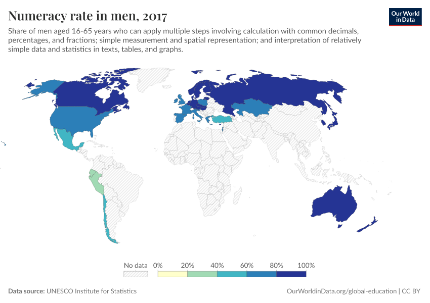 “Data Page: Numeracy rate in men”, part of the following publication: Hannah Ritchie, Veronika Samborska, Esteban Ortiz-Ospina, and Max Roser (2023) - “Global Education”. Data adapted from UNESCO Institute for Statistics. Retrieved from https://tag-updates.owid.pages.dev:8789/20251120-211749/grapher/numeracy-rate-in-adult-men.html [online resource] (archived on November 20, 2025).How to cite this data