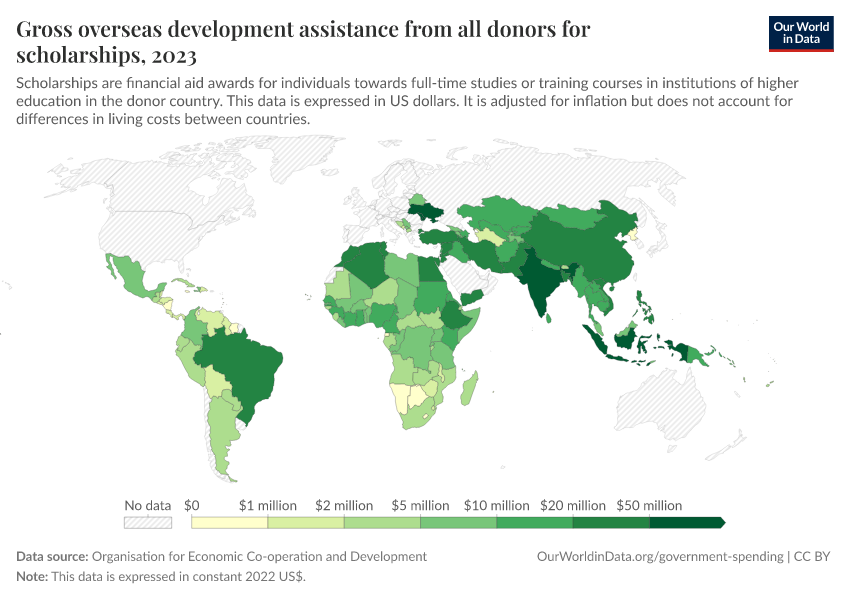 “Data Page: Gross overseas development assistance from all donors for scholarships”, part of the following publication: Max Roser and Esteban Ortiz-Ospina (2016) - “Education Spending”. Data adapted from Organisation for Economic Co-operation and Development. Retrieved from https://tag-updates.owid.pages.dev:8789/20260130-180113/grapher/oda-for-scholarships.html [online resource] (archived on January 30, 2026).How to cite this data