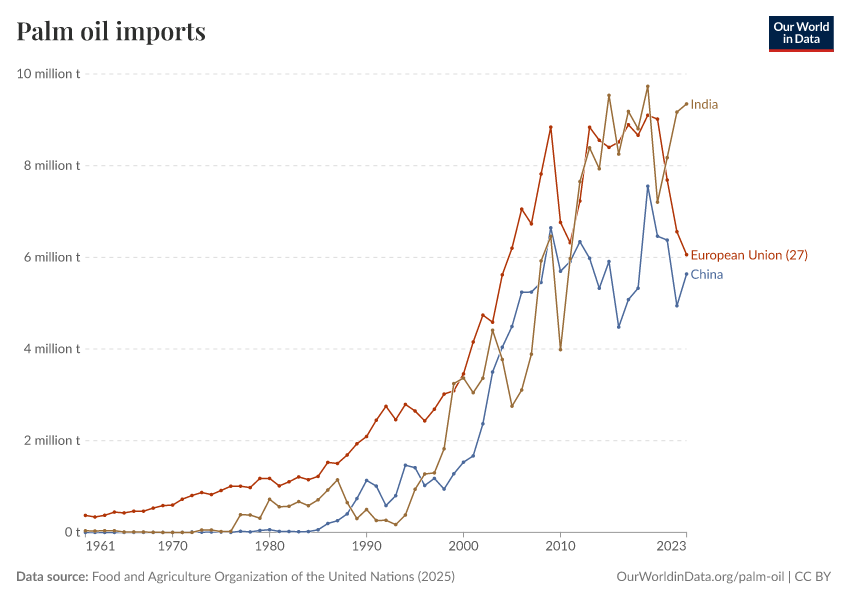 “Data Page: Imports of palm oil”. Our World in Data (2026). Data adapted from Food and Agriculture Organization of the United Nations. Retrieved from https://tag-updates.owid.pages.dev:8789/20260226-122020/grapher/palm-oil-imports.html [online resource] (archived on February 26, 2026).
