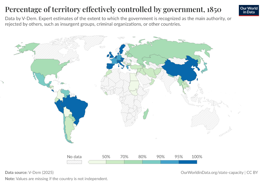 “Data Page: Territory under state control”, part of the following publication: Bastian Herre, Lucas Rodés-Guirao, and Esteban Ortiz-Ospina (2013) - “Democracy”. Data adapted from V-Dem. Retrieved from https://tag-updates.owid.pages.dev:8789/20260119-070102/grapher/percentage-of-territory-controlled-by-government.html [online resource] (archived on January 19, 2026).How to cite this data