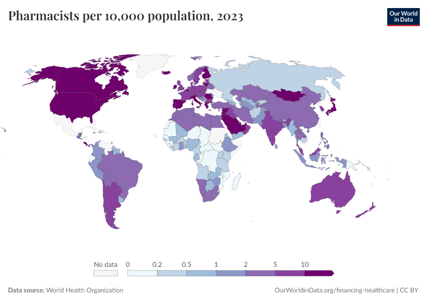 World Health Organization – with minor processing by Our World in Data. “Pharmacists per 10,000 population” [dataset]. World Health Organization, “Data from multiple sources” [original data]. Retrieved February 27, 2026 from https://tag-updates.owid.pages.dev:8789/20260130-180113/grapher/pharmaceutical-personnel-per-1000.html (archived on January 30, 2026).