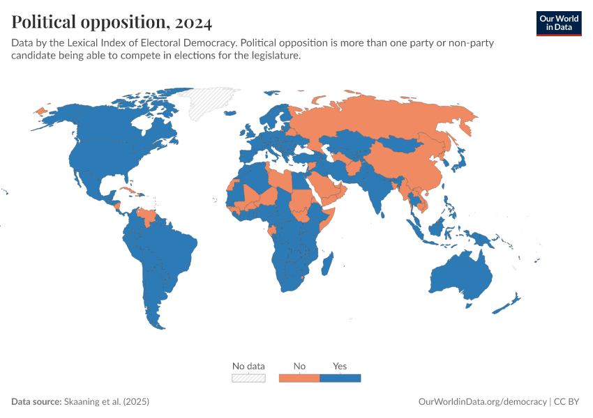 Skaaning et al. (2025) – processed by Our World in Data. “Political opposition” [dataset]. Skaaning et al., “Lexical Index of Electoral Democracy (LIED) v6.8” [original data]. Retrieved February 27, 2026 from https://tag-updates.owid.pages.dev:8789/20260119-065148/grapher/political-opposition-lexical.html (archived on January 19, 2026).