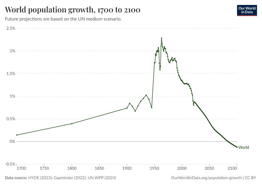 “Data Page: World population growth”, part of the following publication: Hannah Ritchie, Lucas Rodés-Guirao, Edouard Mathieu, Marcel Gerber, Esteban Ortiz-Ospina, Joe Hasell, and Max Roser (2023) - “Population Growth”. Data adapted from PBL Netherlands Environmental Assessment Agency, Gapminder, United Nations. Retrieved from https://tag-updates.owid.pages.dev:8789/20260223-142202/grapher/population-growth-rate.html [online resource] (archived on February 23, 2026).How to cite this data