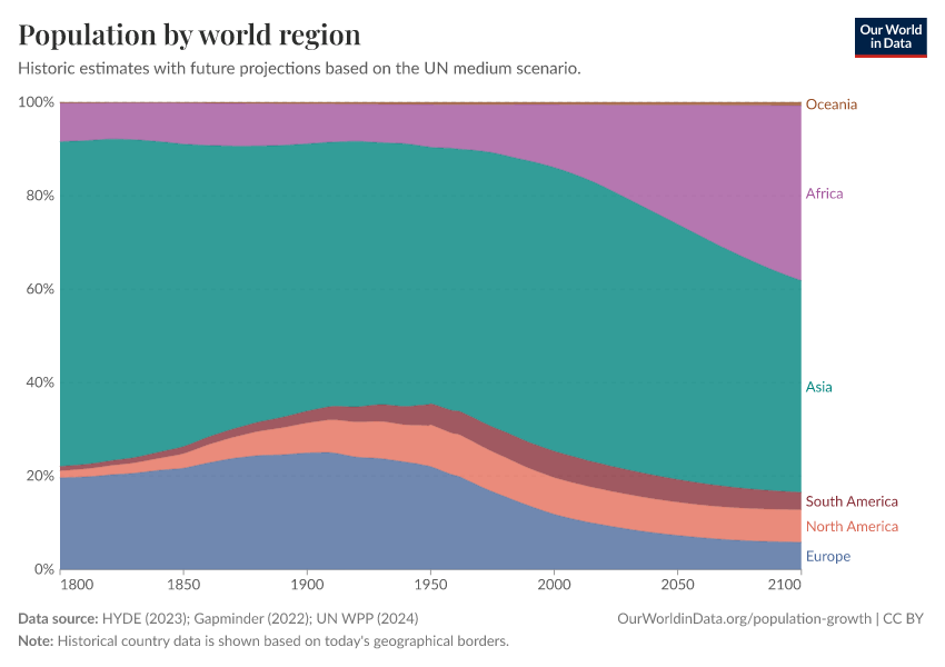 “Data Page: Population by world region”, part of the following publication: Hannah Ritchie, Lucas Rodés-Guirao, Edouard Mathieu, Marcel Gerber, Esteban Ortiz-Ospina, Joe Hasell, and Max Roser (2023) - “Population Growth”. Data adapted from PBL Netherlands Environmental Assessment Agency, Gapminder, United Nations. Retrieved from https://tag-updates.owid.pages.dev:8789/20260119-065148/grapher/population-regions-with-projections.html [online resource] (archived on January 19, 2026).How to cite this data