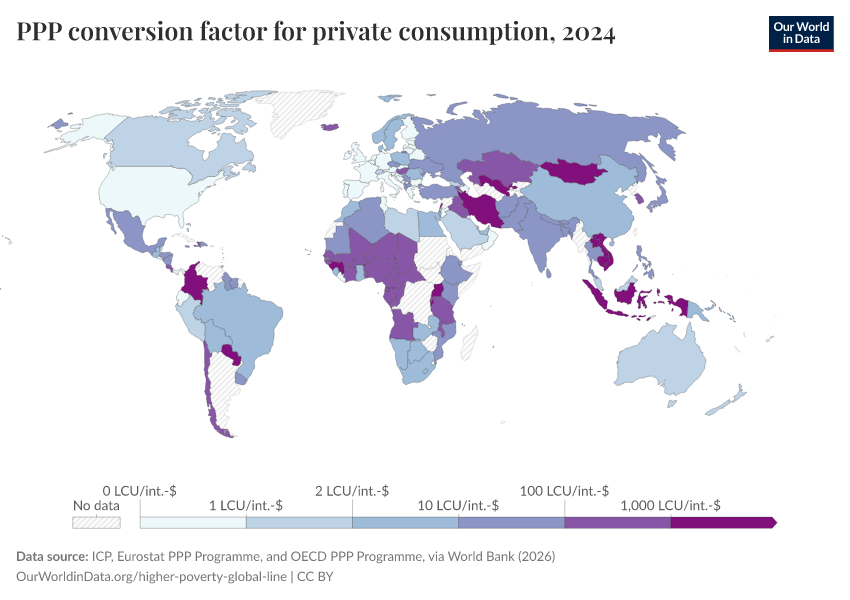 “Data Page: PPP conversion factor for private consumption”. Our World in Data (2026). Data adapted from ICP, Eurostat PPP Programme, and OECD PPP Programme, via World Bank. Retrieved from https://tag-updates.owid.pages.dev:8789/20260202-181317/grapher/ppp-conversion-factor-for-private-consumption.html [online resource] (archived on February 2, 2026).How to cite this data