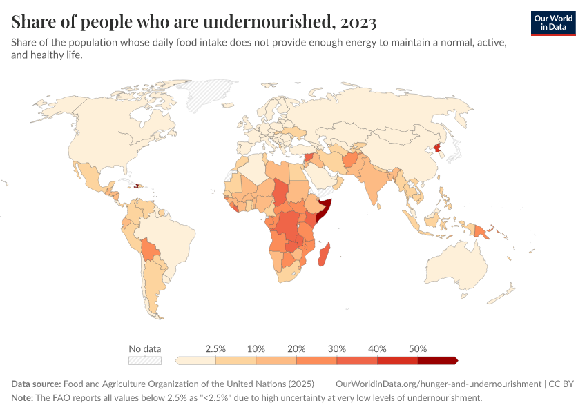 • Many countries, especially high-income ones, are shown at 2.5% because the FAO reports values between 0% and 2.5% as "<2.5%", due to uncertainty at very low levels of undernourishment.