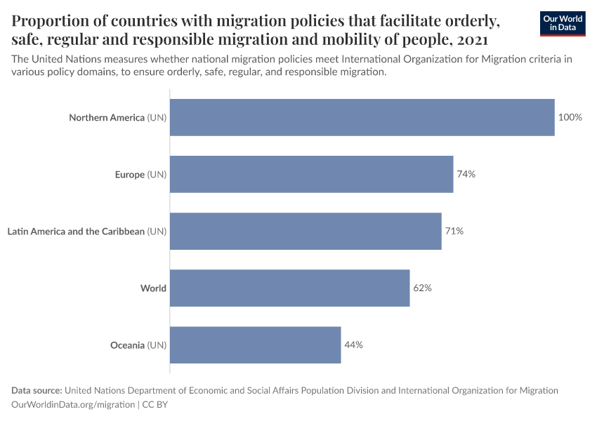 “Data Page: Proportion of countries with migration policies that facilitate orderly, safe, regular and responsible migration and mobility of people”, part of the following publication: Fiona Spooner, Tuna Acisu, Simon van Teutem, Hannah Ritchie, Esteban Ortiz-Ospina, Marcel Gerber, and Max Roser (2022) - “Migration”. Data adapted from United Nations Department of Economic and Social Affairs Population Division and International Organization for Migration. Retrieved from https://tag-updates.owid.pages.dev:8789/20260130-180113/grapher/proportion-countries-migration-policies-criteria.html [online resource] (archived on January 30, 2026).How to cite this data