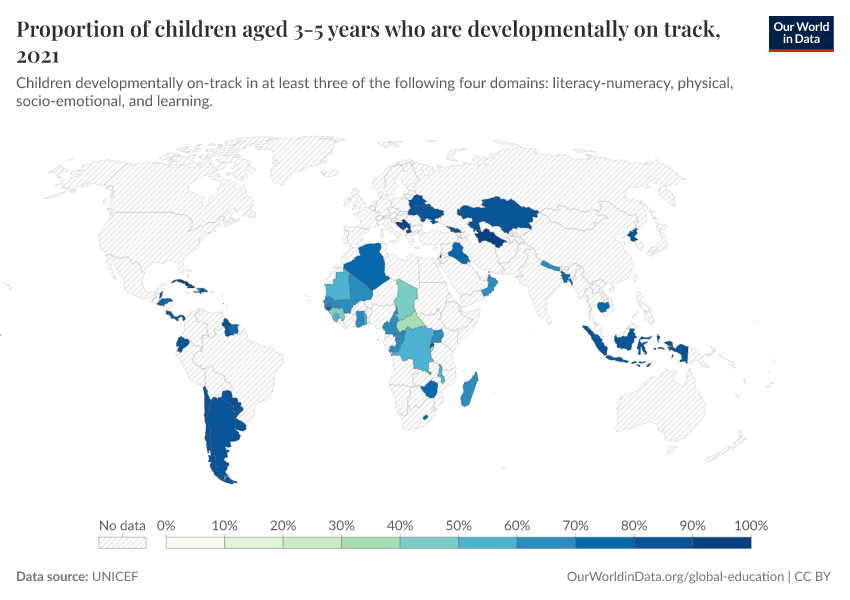 “Data Page: Proportion of children aged 3-5 years who are developmentally on track”, part of the following publication: Hannah Ritchie, Veronika Samborska, Esteban Ortiz-Ospina, and Max Roser (2023) - “Global Education”. Data adapted from UNICEF. Retrieved from https://tag-updates.owid.pages.dev:8789/20260105-133053/grapher/proportion-of-children-developmentally-on-track.html [online resource] (archived on January 5, 2026).How to cite this data