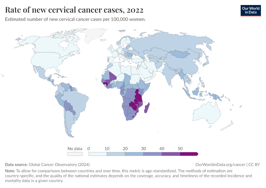 “Data Page: Rate of new cervical cancer cases”, part of the following publication: Saloni Dattani, Veronika Samborska, Hannah Ritchie, and Max Roser (2024) - “Cancer”. Data adapted from Global Cancer Observatory. Retrieved from https://tag-updates.owid.pages.dev:8789/20250909-093708/grapher/rate-of-new-cervical-cancer-cases-gco.html [online resource] (archived on September 9, 2025).How to cite this data