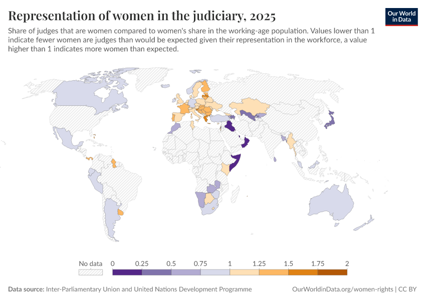 “Data Page: Representation of women in the judiciary”, part of the following publication: Hannah Ritchie and Max Roser (2019) - “Gender Ratio”. Data adapted from Inter-Parliamentary Union and United Nations Development Programme. Retrieved from https://tag-updates.owid.pages.dev:8789/20260105-133053/grapher/representation-of-women-in-the-judiciary.html [online resource] (archived on January 5, 2026).How to cite this data