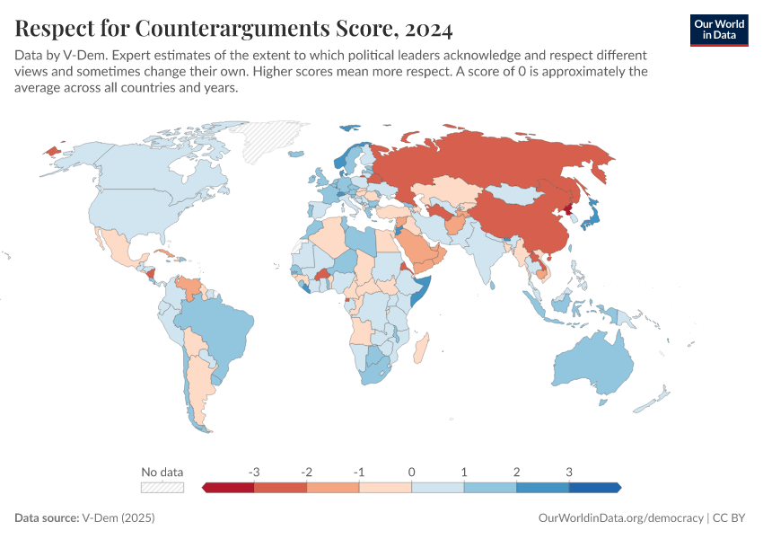 “Data Page: Respect for counterarguments”, part of the following publication: Bastian Herre, Lucas Rodés-Guirao, and Esteban Ortiz-Ospina (2013) - “Democracy”. Data adapted from V-Dem. Retrieved from https://tag-updates.owid.pages.dev:8789/20260204-170225/grapher/respect-for-counterarguments-score.html [online resource] (archived on February 4, 2026).How to cite this data